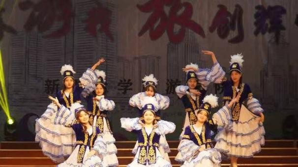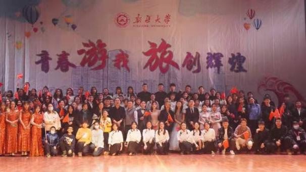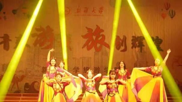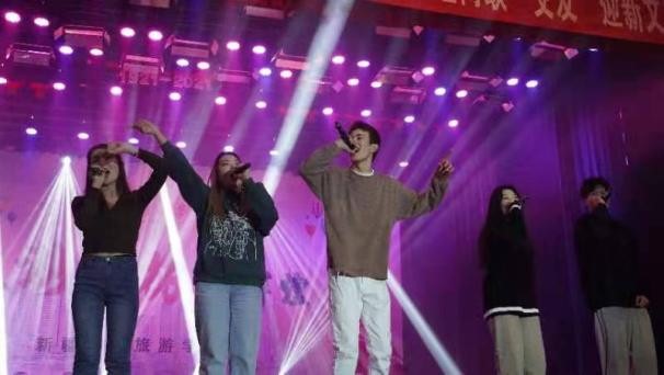 在火热的开场舞《我为祖国喝彩》中,我们的晚会拉开了帷幕。缤纷多彩的服装,轻盈绝伦的舞步,这一时刻,场下的同学们无不为祖国而喝彩,无不为各族师生“石榴籽”一般的团结而欢呼。一曲《漠河舞厅》,不仅融化了大家心中的雪,也将衰老与惊讶尘封入海。金陵芳钗,春秋傲骨,“休言女子非英物,夜夜龙泉壁上鸣。”《金陵》表现了在抗战的大背景之下,一位位巾帼英雄坎坷而又豪壮的经历。旅游21-1班的高健乔和王运兆带来的相声赢得现场满堂欢笑。“红日升在东方,其大道满霞光。我何其幸,生于你怀。”最后的大合唱《万疆》则抒尽了我们新时代老员工对祖国日益强大的自豪感,以及我们为之而弘毅笃行、不懈奋斗的决心。