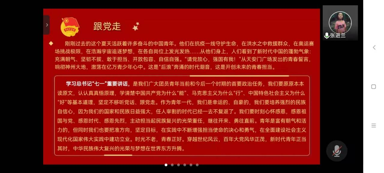 为了激励广大同学们以“功成不必在我,功成必定有我”的责任担当,积极学习科学文化知识,不断强化自身能力,以实际行动争做新时代的斗争先锋,2021年9月15日下午15:30,bevictor伟德在腾讯会议平台上开展了主题为《奋斗正青春,青春献给党》的主题团日活动 。本次主题团日活动由各班团支书领学,学习了在中国共产党成立100周年大会上习近平总书记的重要讲话精神以及庆祝大会上共青团员和少先队员代表的集体献词。