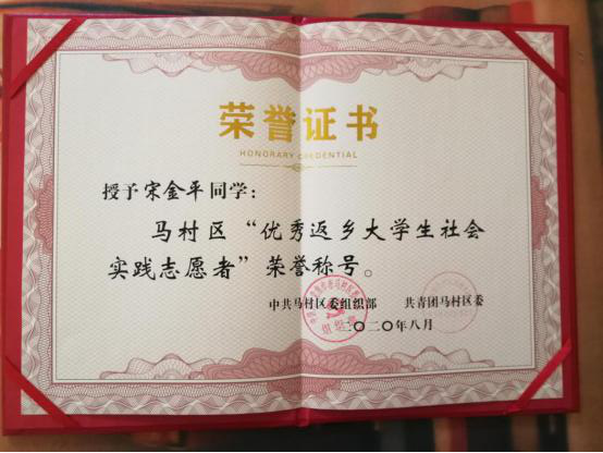 宋金平同学在实践活动期间的优秀表现,也得到了家乡团区委和街道办的一致好评,被推选为马村区“优秀返乡老员工社会实践志愿者”荣誉称号、2020年全国大中专员工志愿者暑期“三下乡”社会实践“优秀个人”称号。