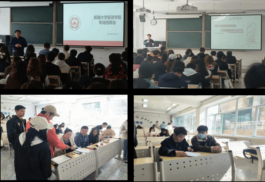 活动伊始,陈文新书记代表公司对喀纳斯旅游发展股份有限公司的到来表示欢迎,并为在场毕业生分析就业发展动向,对同学们未来就业方向提出指导和建议。招聘会上,“喀旅”民俗风情园罗经理就公司情况、业务板块、发展前景、招聘岗位要求等方面进行了讲解,并欢迎在场同学加入“喀旅”大家庭。随后,公司人力资源部徐玉洁经理、营销部副经理尹凯等企业代表对有求职意向同学的咨询进一步解答。同学们对招聘会抱以极大热情,并积极投递简历。