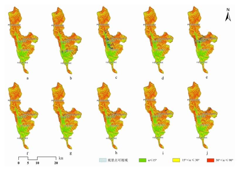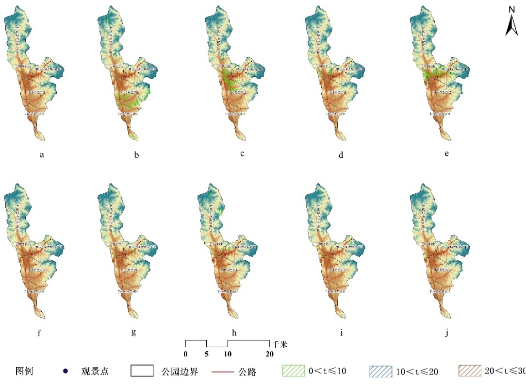 值得注意的是,以美景度为优势的可可苏里、伊雷木湖、金三角,结合GIS技术评价后,综合评分排名有所后移。美景度不具优势的卡拉先格尔地震断裂带,结合GIS评价后,综合评分排名前移。参观者在游览中常按自己喜好的路线进行,依据主观审美判断景观优美程度更符合参观者衡量景观质量的标准,GIS技术从宏观的角度把握景观特征,但观测视角不同于人的审美。反映出两种方法在景观质量评价中各有侧重。