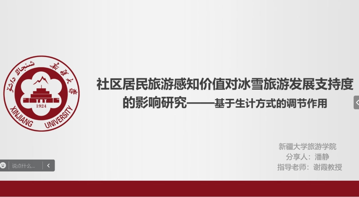 首先,由潘静同学对《社区居民旅游感知价值对冰雪旅游发展支持度的影响研究——基于生计方式的调节作用》进行了解读,主要介绍了研究背景、概念界定、理论基础、研究假设、研究设计、实证分析和结论与讨论。详细讲述了中介效应检验运用的方法和工具、操作过程以及最后呈现的结果表示的意义分析。内容详实易懂,使大家学习到学术报告中使用的研究方法和技术。